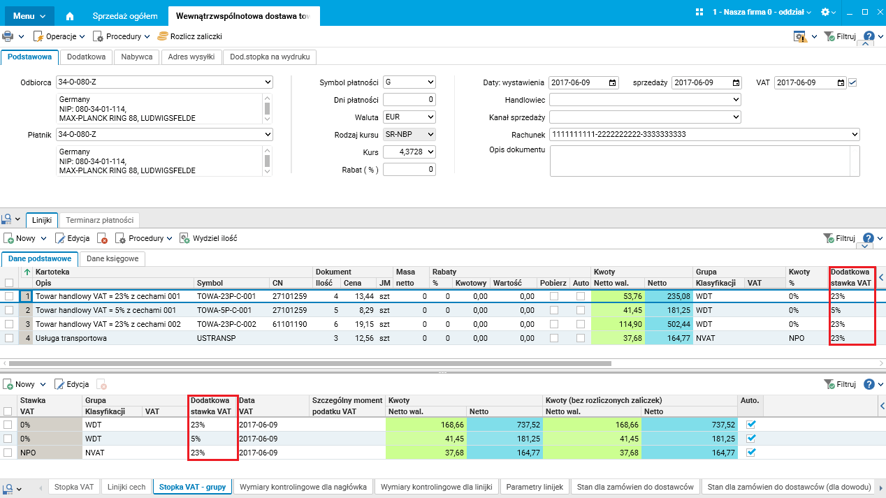 Po wykonaniu odpowiedniej konfiguracji w rejestrach zakupu oraz sprzedaży może zapisywać się informacja o dodatkowej stawce VAT. Na dowodach importowych, eksportowych oraz podlegających transakcjom dotyczącym odwrotnego obciążenia po podmianie stawki VAT w polu Dodatkowa stawka VAT zapisuje się informacja o stawce VAT krajowej. Przy wyliczaniu informacji w szczególe Stopka VAT – grupy również została uwzględniona dodatkowa stawka VAT.