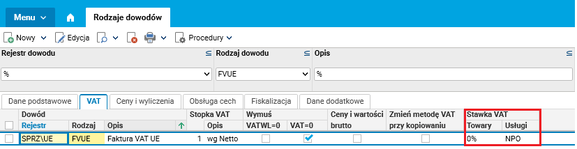 Na potrzeby zmian stawek VAT dla transakcji opisanych powyżej w słowniku Rodzaje dowodów, w polach Stawka VAT;Towary oraz Stawka VAT;Usługi została dodana możliwość określenia dla danego dowodu różnych stawek VAT dla towarów i usług (wcześniej było jedno pole wspólne dla towarów oraz usług). Dzięki takiej zmianie wybrana stawka VAT ustawiana jest niezależnie dla towarów i usług we wszystkich pozycjach dowodów, dla których została przeprowadzona konfiguracja.