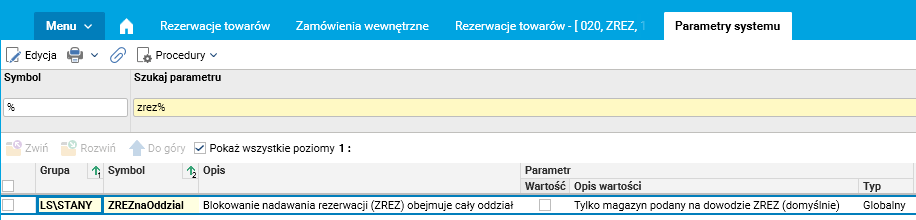 Rys. Domyślna konfiguracja parametru globalnego ZREZnaOddzial