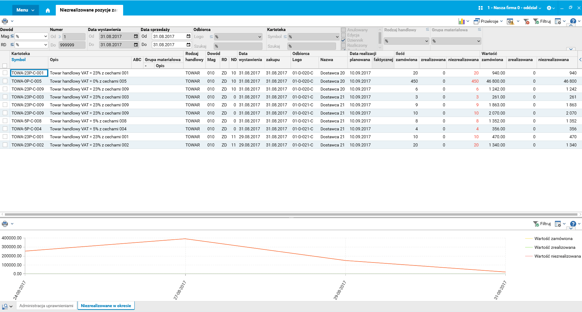 Rozszerzeniem prezentowanych w głównej tabeli danych jest szczegół Niezrealizowane w okresie, który przedstawia wykres zależności wartości zamówionej, zrealizowanej, niezrealizowanej w zależności od daty.