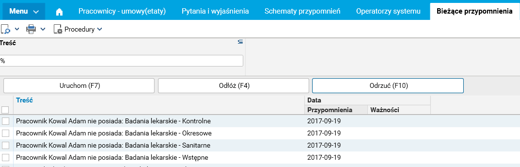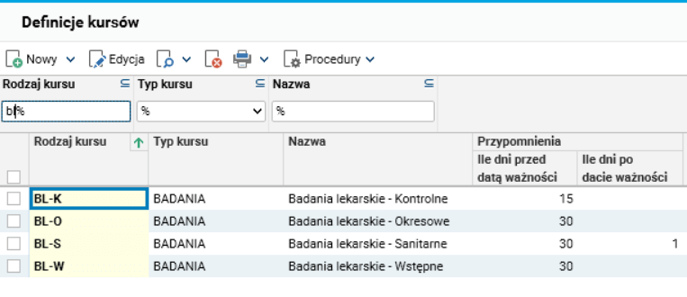 Od tej chwili (dla prezentowanego na zrzutach ekranów przypadku) przypomnienie dla badań lekarskich okresowych (BL-O) pojawi się po raz pierwszy 30 dni przed datą końca ważności poprzedniego badania danego pracownika i poinformuje o konieczności wysłania go na kolejne badanie okresowe.