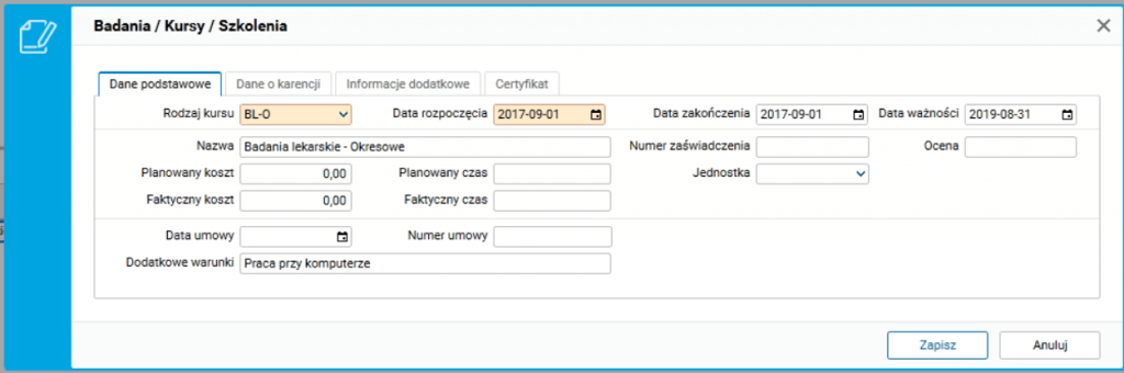 Po odpowiednim skonfigurowaniu systemu należy uzupełnić daty ważności ostatnich badań pracowników.