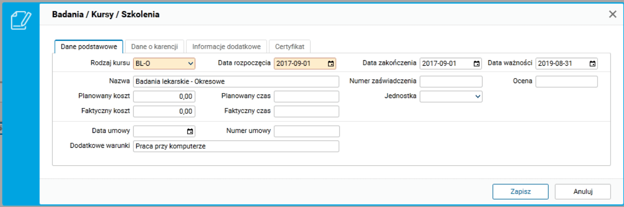 Rys. 2. Słownik Pracownicy – umowy (etaty), szczegół Badania / Kursy/ Szkolenia – okno dodawania nowego badania, kursu lub szkolenia