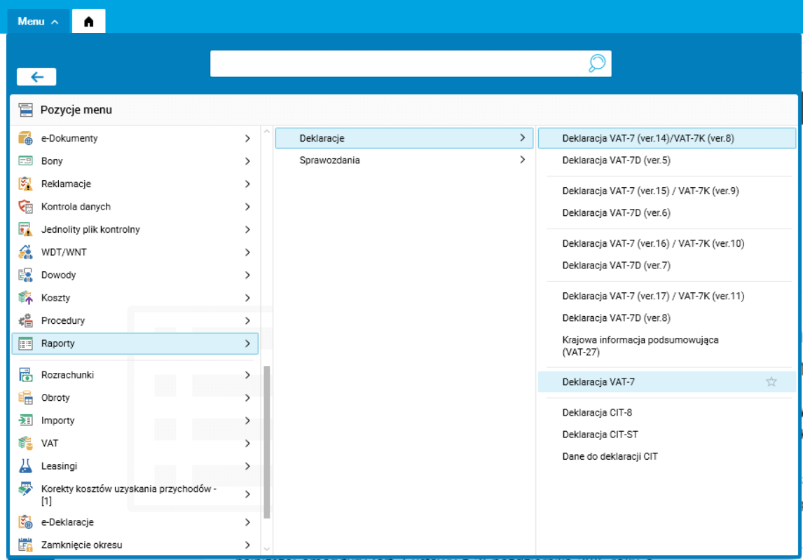 Do Menu do zakładki Raporty –> Deklaracje dodano nowy słownik Deklaracja VAT-7.