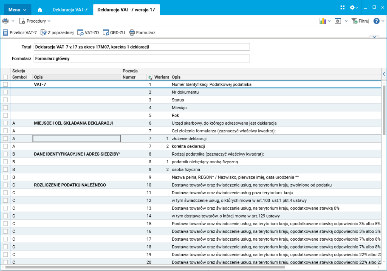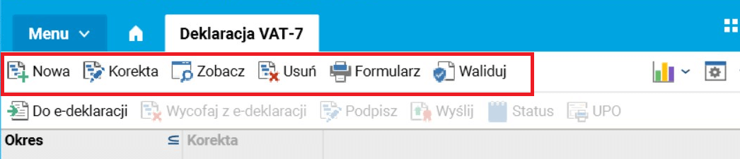 · Nowa – tworzy nową deklarację VAT-7, możliwość użycia skrótu klawiszowego (ALT+N),