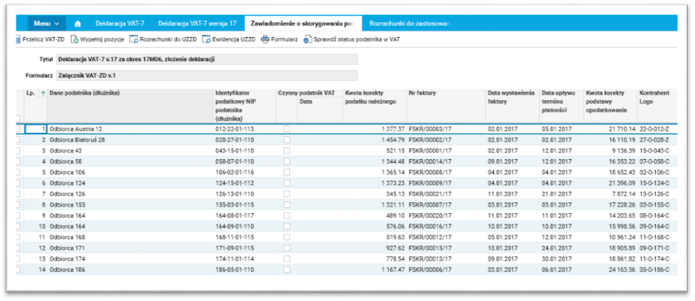 · VAT-ZD – zawiadomienie o skorygowaniu podstawy opodatkowania oraz kwoty podatku należnego. Po uruchomieniu tej akcji otwierany jest słownik Zawiadomienie o skorygowaniu podstawy opodatkowania oraz kwoty podatku należnego, w którym jest możliwość podłączenia formularz VAT-ZD do deklaracji VAT-7.