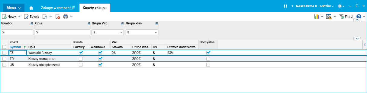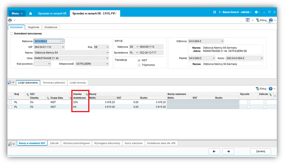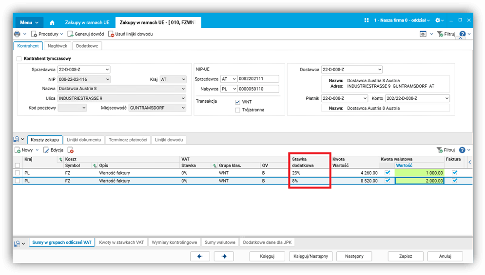 Stawka dodatkowa została dodana do słownika Zakupy w ramach UE, w którym rejestrowane są koszty zakupu WNT. Dla transakcji wewnątrzwspólnotowego nabycia towarów należy zastosować stawkę 0% i taką wartość trzeba wpisać w pole Stawka VAT. Dla poprawnego wygenerowania dokumentów wewnętrznych z tyt. WNT należy uzupełnić również pole Stawka dodatkowa poprzez wpisanie tam symbolu stawki krajowej, według której ma być opodatkowana transakcja. Jeśli dokument zawiera towary, które w kraju są opodatkowane różnymi stawkami, np. zarówno stawką 23%, jak i 8%, to koszty zakupu trzeba rozbić na dwie pozycje.