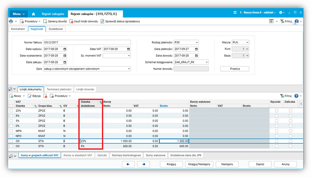 Rys. Stawka dodatkowa w rejestrze zakupów – zakładka Linijki dokumentu