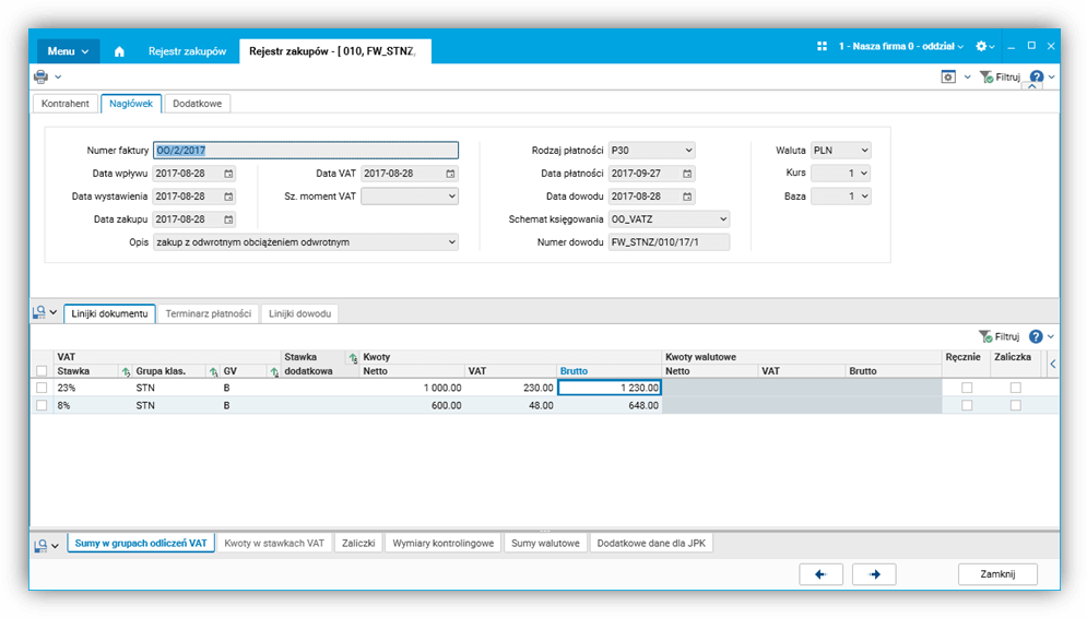 Stawka dodatkowa została dodana również do zakładki Linijki dokumentu, w której rejestrowane są linijki dokumentu w podziale na stawki VAT. Zmiana będzie opisana na przykładzie zakupu towaru podlegającego odwrotnemu obciążeniu (OO). Aby zarejestrować taką transakcję, należy zastosować stawkę OO, a dla poprawnego wygenerowania dokumentów wewnętrznych należy uzupełnić pole Stawka dodatkowa poprzez wpisanie tam symbolu stawki krajowej, według której ma być opodatkowana transakcja. Jeśli dokument zawiera towary, które są opodatkowane różnymi stawkami, np. zarówno stawką 23%, jak i 8%, to linijki ze stawką OO należy rozbić na dwie pozycje.