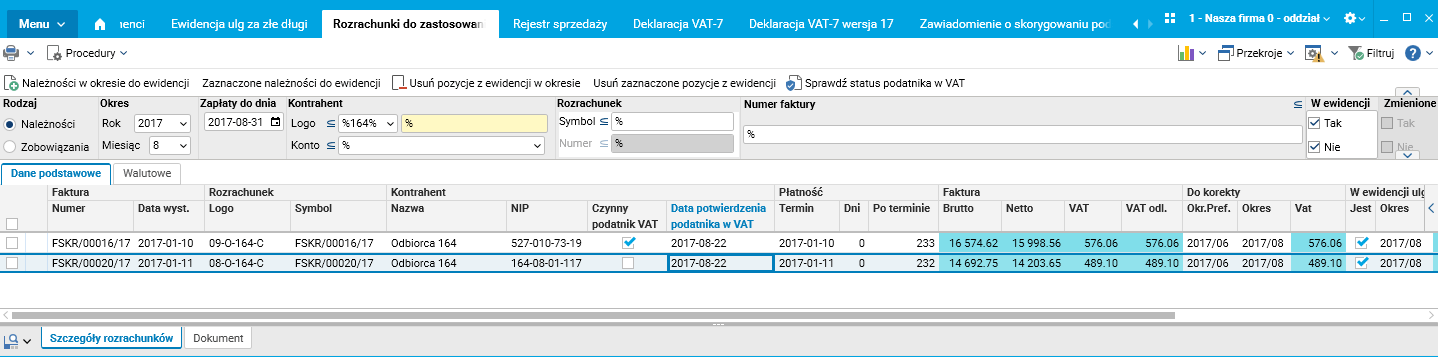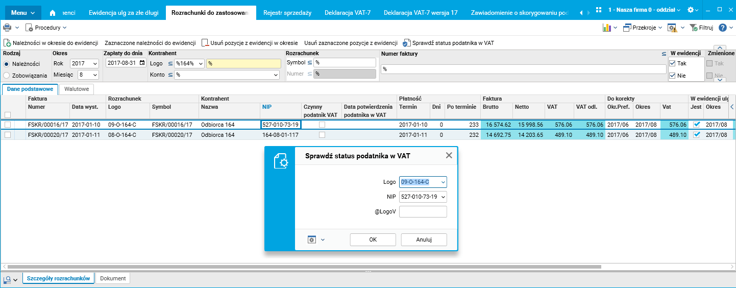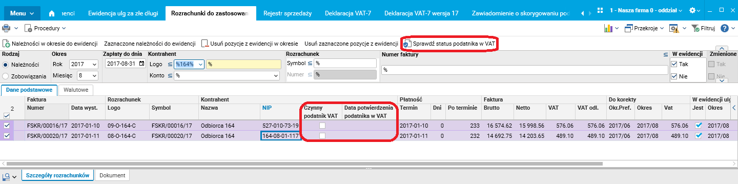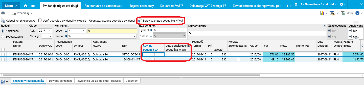 Rys. Procedura Sprawdź status podatnika w VAT w słowniku Rozrachunki do zastosowania ulgi za złe długi oraz dodatkowe kolumny statusu podatnika w VAT