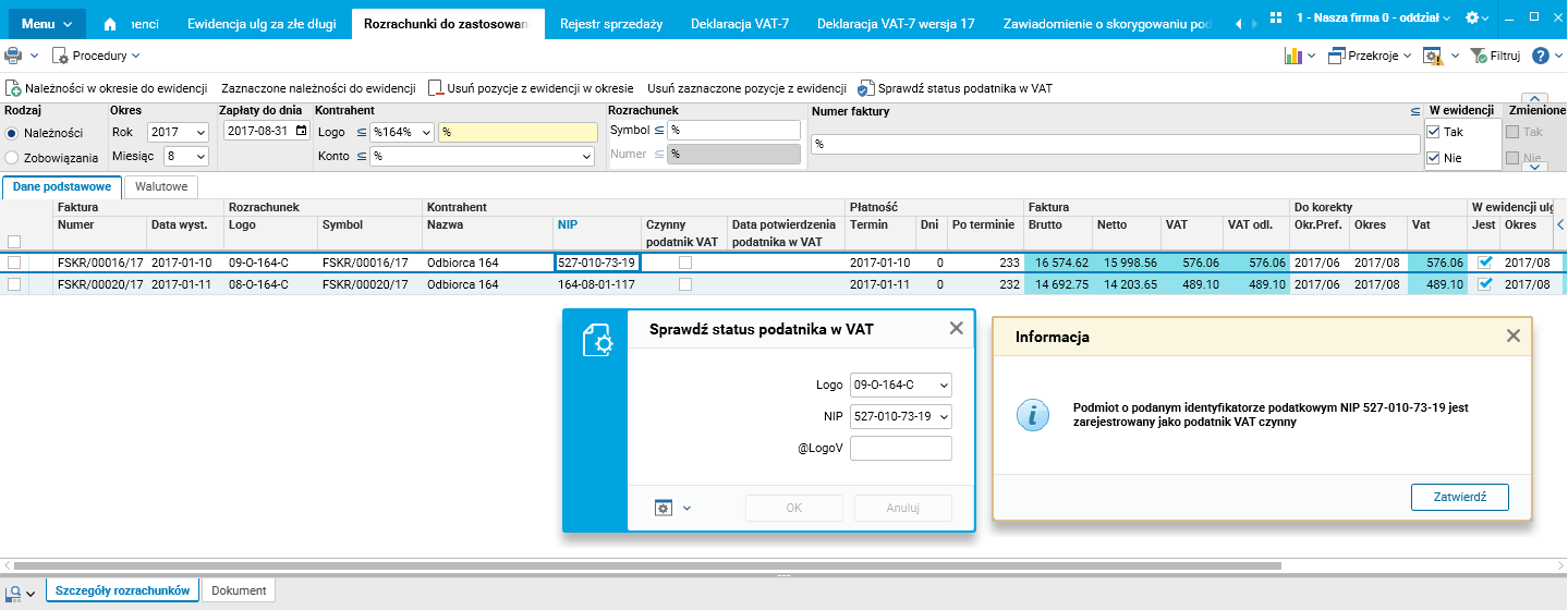 Umożliwiono weryfikację statusu podatnika VAT w słownikach związanych z ewidencją ulg za złe długi, analogiczną do weryfikacji dostępnej na słowniku Kontrahenci.