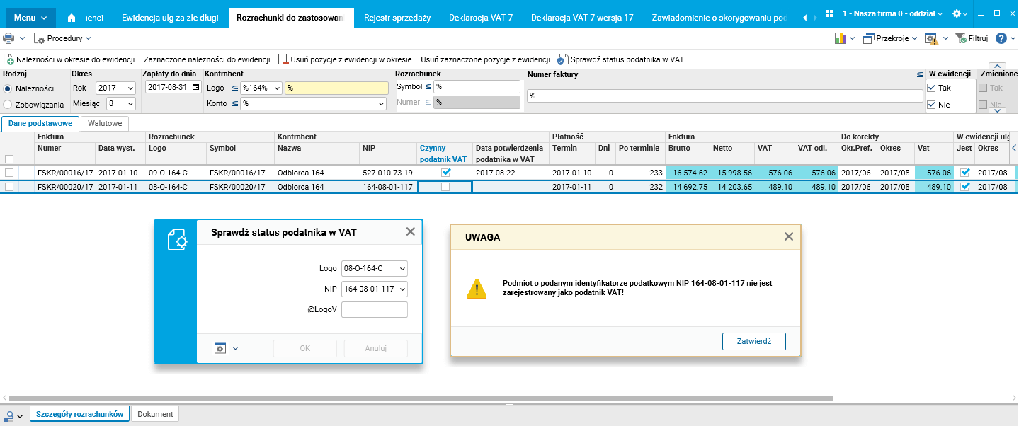 5. Podczas przenoszenia rozrachunków ze słownika Rozrachunki do zastosowania ulgi za złe długi do słownika Ewidencja ulg za złe długi sprawdzany jest status podatnika VAT zapisany w słowniku Kontrahenci systemu Softlab ERP.