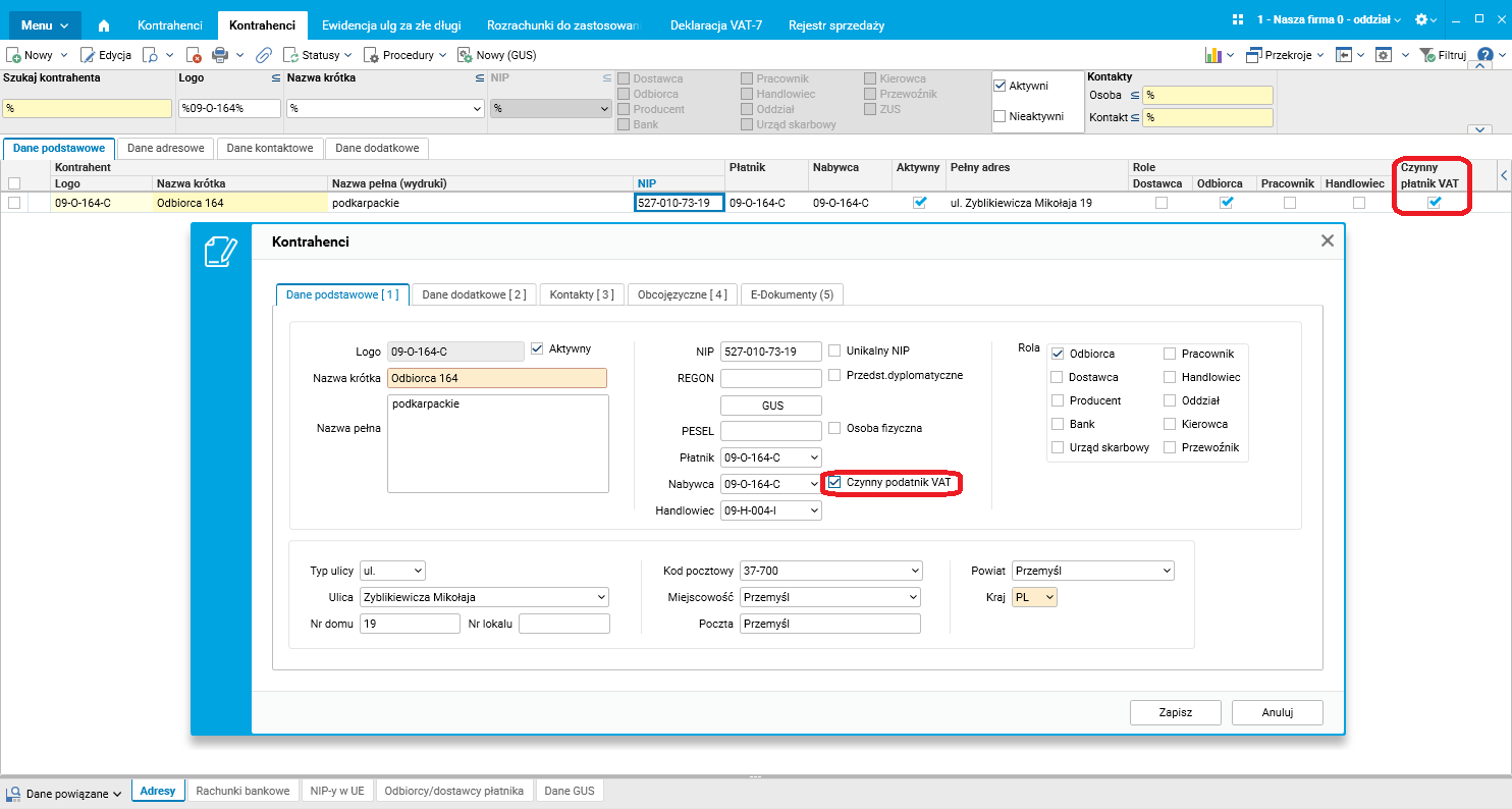 Rys. Odczytany status podatnika zapisany w słowniku Kontrahenci