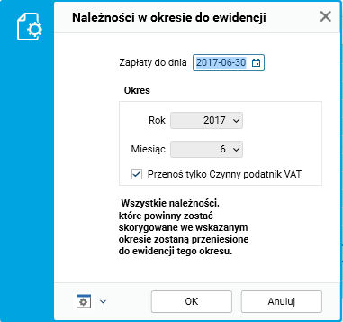 Przy wywołaniu procedury Należności w okresie do ewidencji lub Zobowiązania w okresie do ewidencji istnieje możliwość przeniesienia rozrachunków tylko czynnych podatników VAT lub tylko nieczynnych podatników VAT. Domyślnie parametr Przenoś tylko Czynny podatnik VAT jest włączony.