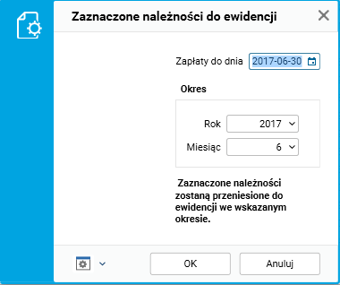 Przenoszenie rozrachunków można wykonywać zbiorczo dla wszystkich (procedura Należności w okresie do ewidencji) z podanego okresu lub wybiórczo poprzez ich zaznaczenie (procedura Zaznaczone należności do ewidencji).