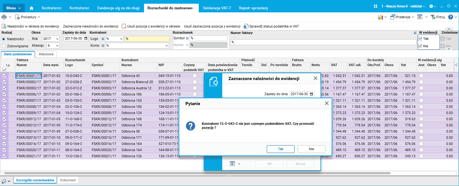 Przy wywołaniu procedury Zaznaczone należności do ewidencji lub Zaznaczone zobowiązania do ewidencji nie ma możliwości określenia, czy przenosimy rozrachunki kontrahentów, którzy są czynnym podatnikiem VAT, czy tych, którzy nim nie są.