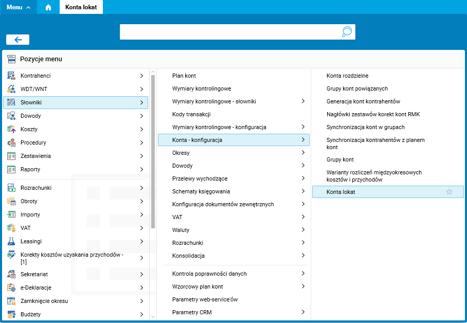 W systemie dostępny jest słownik Konta lokat definiujący konta lokat.