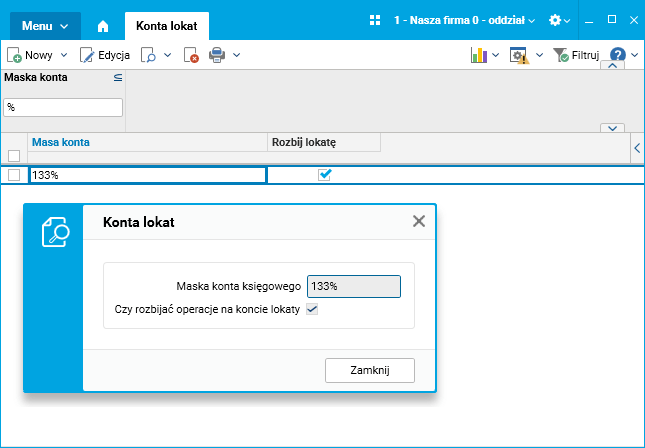 Pole Maska konta księgowego wskazuje listę kont księgowych, na których księgujemy operacje lokat. Konto lokaty powinno być oznaczone jako klasyfikowane.