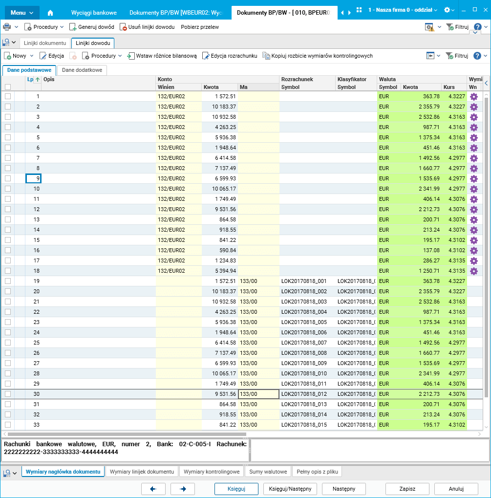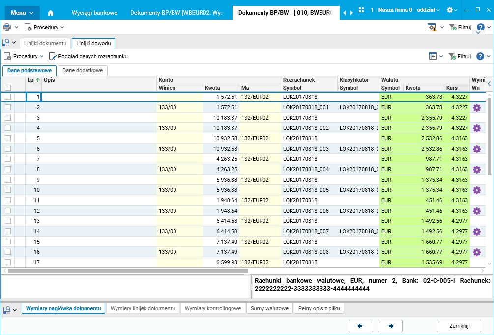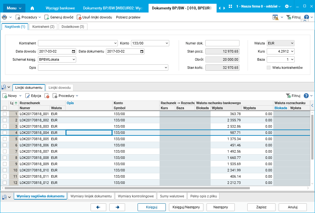 Jeśli na wyciągu bankowym wystąpi operacja założenia lokaty (czyli wypłata na konto lokaty), system automatycznie w momencie zatwierdzenia dokumentu rozbije operację na wiele pozycji wg kursów historycznych.
