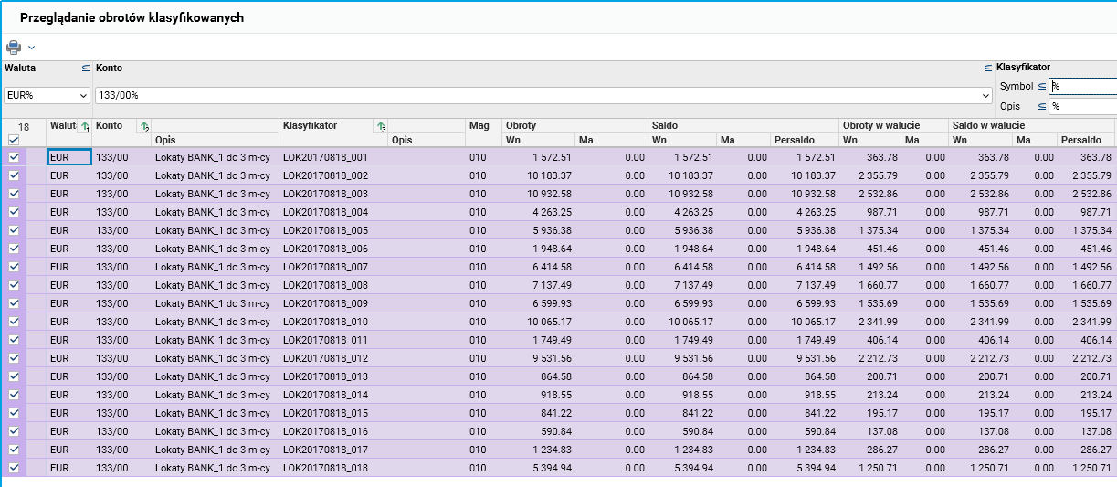 Operacje na lokatach identyfikowane są przez przeciwstawne konto księgowe. Konto lokaty musi być klasyfikowane. Dzięki klasyfikatorom przy likwidowaniu lokaty system może wyznaczyć poprawnie kurs historyczny poszczególnych operacji.