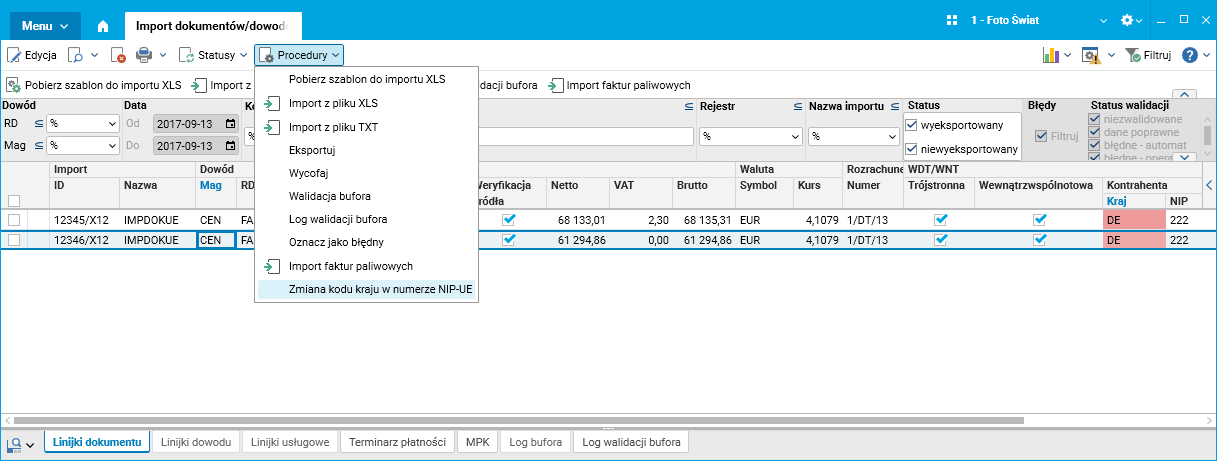 Dokumenty powinny mieć ustawiony kod kraju zgodny z kodem kraju e-deklaracji ze słownika Kraje. Dzięki nowej procedurze Zmiana kodu kraju w numerze NIP-UE użytkownik nie musi weryfikować wartości kraju przed importem dokumentów, a po imporcie może grupowo poprawić tą wartość.