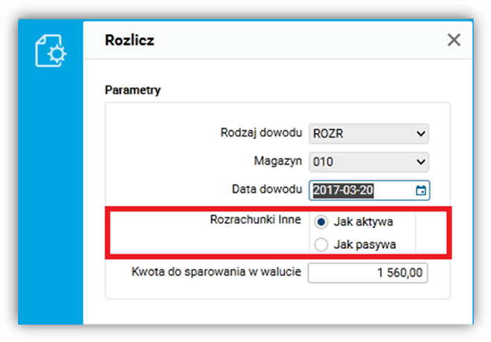 Celem zmiany było umożliwienie wyboru przez użytkownika sposobu rozliczenia rozrachunków Inne przy parowaniu rozrachunków.