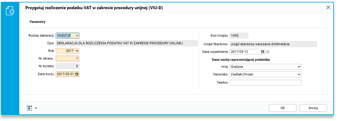 Do parametrów procedury naliczającej deklarację VIU-D dodano następujące dane: urząd skarbowy, data wypełnienia, dane osoby reprezentującej płatnika: imię i nazwisko, telefon. Dane te są zapisywane w nagłówku utworzonej deklaracji.