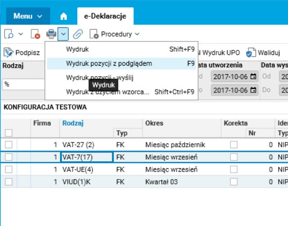 Wydruk deklaracji z numerem referencyjnym w celach udokumentowania wykonywany jest poprzez tradycyjny mechanizm wydruków – akcja Wydruk pozycji z podglądem (F9).