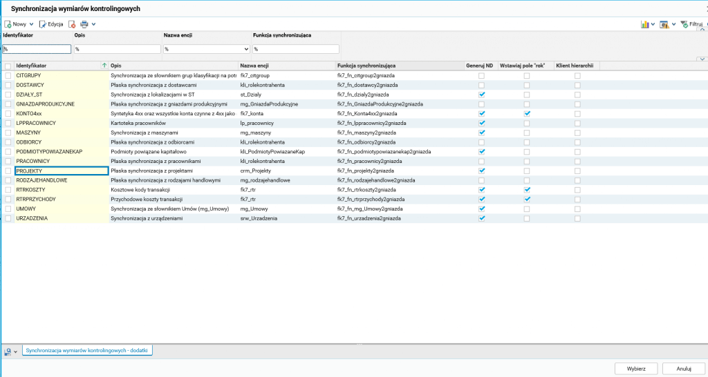 W słowniku Rodzaje wymiarów w kolumnie Synchronizuj z … można wskazać funkcję synchronizującą określającą, z jakim słownikiem dany rodzaj wymiaru będzie synchronizowany oraz w jaki sposób. Lista proponowanych funkcji synchronizujących nie jest zamknięta i przy wsparciu konsultantów może być rozszerzona o dowolny istniejący lub nowo zaprojektowany słownik. Po podłączeniu wybranej funkcji synchronizującej konieczne jest oznaczenie, w których firmach ma być aktywna (wymiary mają być synchronizowane z danym słownikiem).
