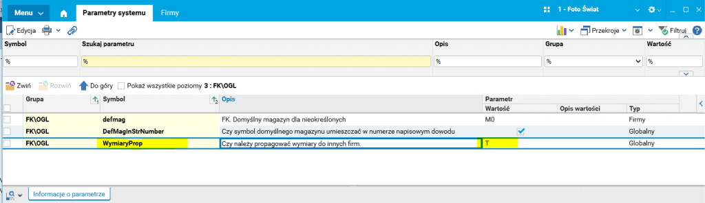 W tym celu należy zweryfikować wartość parametru globalnego WymiaryProp. Oczekiwana wartość parametru to T.