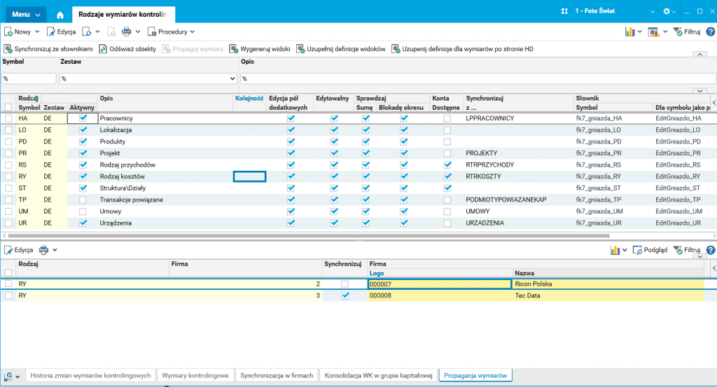 W ramach grupy kapitałowej wykorzystywana jest jednolita struktura wymiarów kontrolingowych. W pewnym momencie podjęto decyzję o rozbudowie ewidencji kosztów, co pociągnęło za sobą konieczność rozbudowy wymiaru kontrolingowego Rodzaj kosztu. Rozbudowę przeprowadzono w firmie Foto Świat, skonfigurowanej wcześniej jako wzorcowa. Po wprowadzeniu nowych wymiarów w firmie Foto Świat, system w tle uzupełnił w identyczny sposób wymiary w firmie Tec Data.