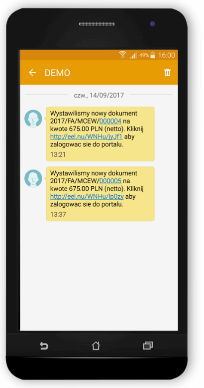 Powiadomienia SMS mogą być przesyłane jako pojedyncza wiadomość dla każdego nowego dokumentu bądź w formie jednej zbiorczej wiadomości zawierającej powiadomienia o wszystkich dokumentach dostarczonych w skonfigurowanym cyklu jej działania (np. w ciągu dnia). SMS-y zostaną wysłane, jeśli przynajmniej jeden kontakt danego partnera ma wprowadzony numer telefonu. Kontakty, które nie mają wprowadzonego numeru telefonu, dostaną informację tylko drogą mailową.