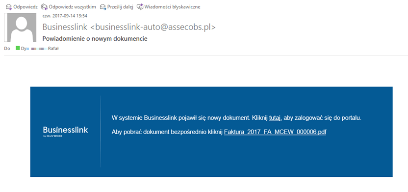 Po skonfigurowaniu powiadomień e-mail w treści wygenerowanej wiadomości e-mail informującej o wystawieniu nowego dokumentu zamieszczany jest też odnośnik do niego. Po kliknięciu odnośnika można pobrać dokument wprost z wiadomości.