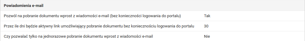 · Przez ile dni będzie aktywny link umożliwiający pobranie dokumentu bez konieczności logowania do portalu na wartość 30, jeśli chcemy aby link były aktywny przez miesiąc,
