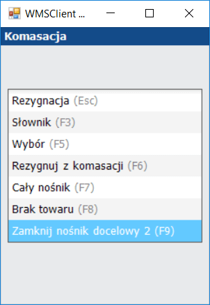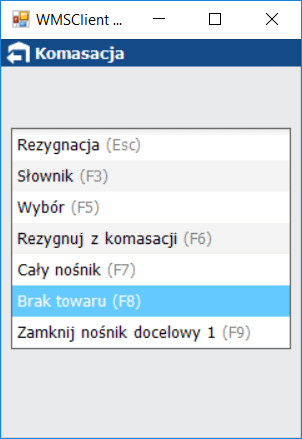 W procesie pakowania w menu dostępnym pod klawiszem F1 na ekranie z wyborem towaru dodano nową opcję Brak towaru (F8).