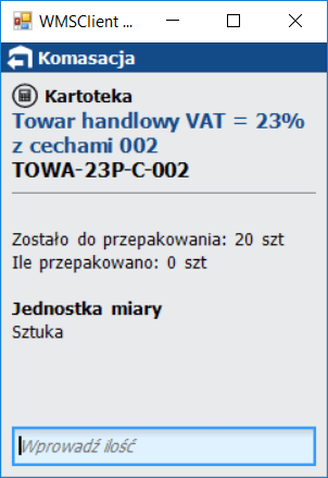 Po wybraniu towaru system pyta o jego brakującą ilość, podając jednocześnie informacje o ilości pozostałej do przepakowania i ilości już przepakowanej przez magazyniera. Pozwala przy tym wprowadzać wartości od 0 do ilości jeszcze nieprzepakowanej.