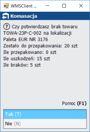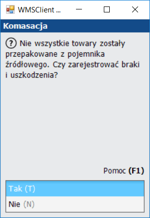 Po wybraniu opcji zamknięcia nośnika pojawia się pytanie: Nie wszystkie towary zostały przepakowane z pojemnika źródłowego. Czy zarejestrować braki i uszkodzenia?