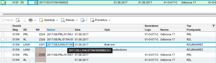Po potwierdzeniu komunikatu system wystawia odpowiednie dowody LINW sprzężone z dowodem ZWYD/ZO, którego dotyczy przepakowywany nośnik. Następuje też wystawienie dokumentów kompletacyjnych z brakującym towarem.