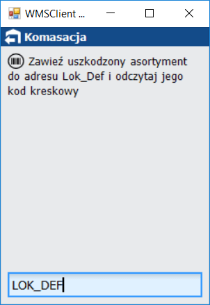 Towar brakujący w systemie zostaje przesunięty automatycznie na lokalizację braków (LOK_INW), natomiast magazynier musi potwierdzić odwiezienie towaru uszkodzonego na lokalizację uszkodzeń (LOK_DEF).
