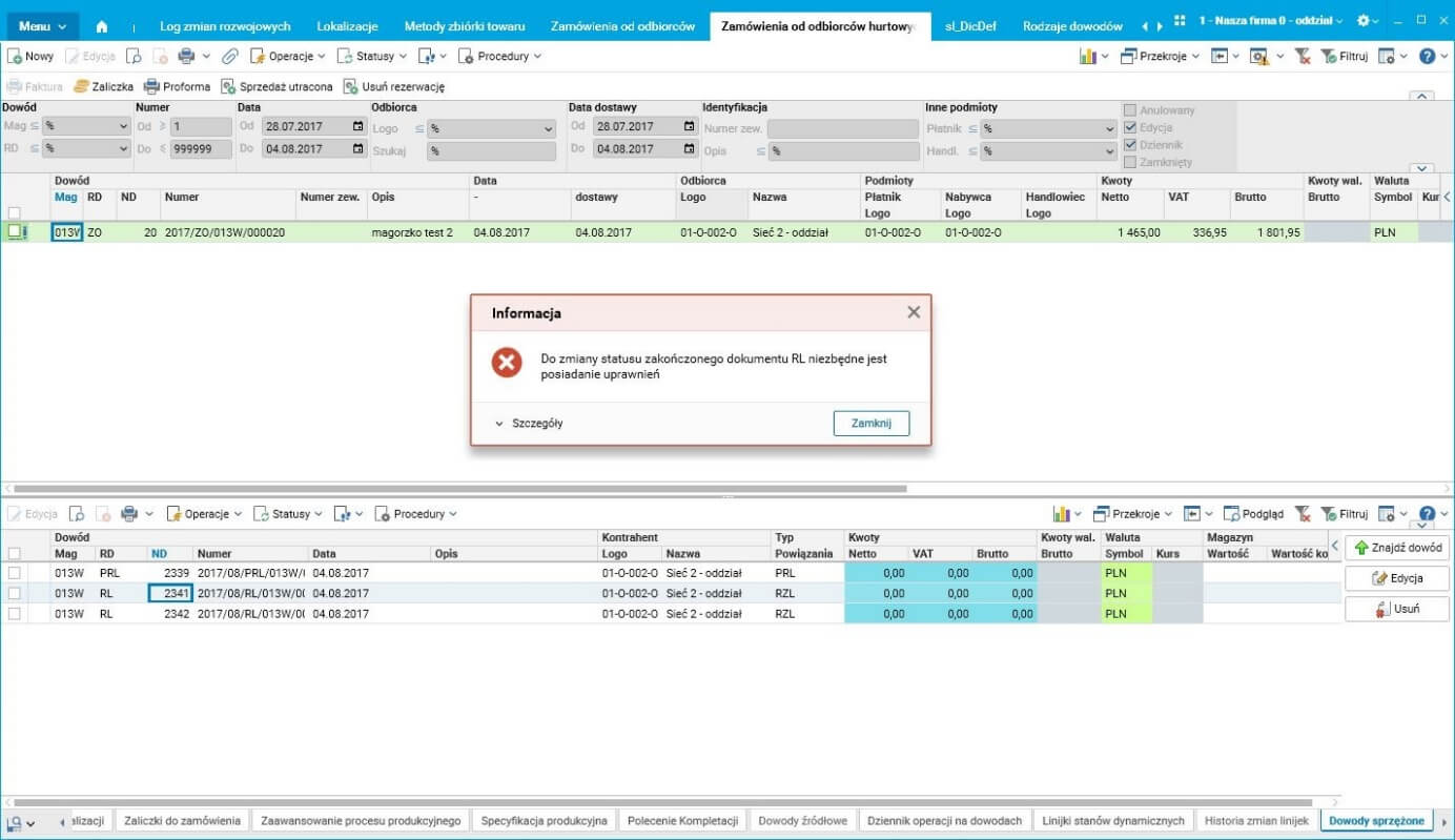 Dodana została funkcja praw STD_WMS_WYC_STAT_ZAKONCZ oraz akcja Zmiana statusu Zakończony na Transportowany/Oczekujący. Podczas próby wycofania dokumentu do edycji przez użytkownika nieposiadającego uprawnień zostanie wyświetlony komunikat: Wycofanie dokumentu RL w stanie Dziennik do edycji nie jest możliwe bez posiadania uprawnień.