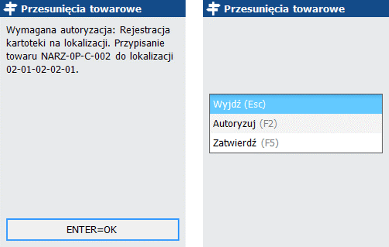 Proces rejestracji kartoteki na lokalizacji podczas rozkładania został uzupełniony o możliwość wymuszenia autoryzacji. W przypadku włączonej rejestracji kartotek na lokalizacji i braku przywileju do wykonania tej czynności operator zobaczy poniższy ekran. W menu znajduje się opcja Autoryzuj (F2), po wybraniu której pojawia się ekran logowania.