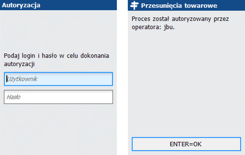 Na ekranie logowania swoje dane powinien wprowadzić użytkownik, który autoryzuje daną czynność. Po poprawnym zalogowaniu przeprowadzona zostanie próba autoryzacji oraz zostanie wyświetlony odpowiedni komunikat. W przypadku braku przywileju lub braku zautoryzowania odłożenia towaru operator będzie mógł odłożyć towar na wybranej lokalizacji, ale towar ten nie zostanie przypisany do danej lokalizacji w kontekście miejsca kompletacji.