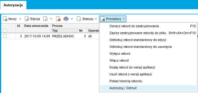 Rys. Wybór z menu procedury Autoryzuj/Odrzuć