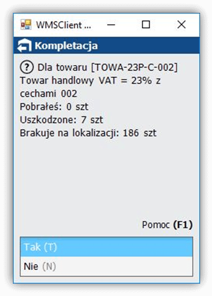 Przed zmianą w procesie kompletacji w aplikacji WMS Client wyświetlana była informacja o ilości pobranej oraz ilości uszkodzonej. Nie była natomiast wyświetlana informacja, jaką ilość brakującą stwierdził użytkownik. Po zmianach ekran potwierdzenia ilości zawiera ilość brakującą widoczną w linii: Brakuje na lokalizacji: … szt.