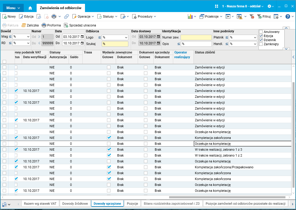 Rys. Słownik Zamówienia od odbiorców z dodaną kolumną Status zbiórki