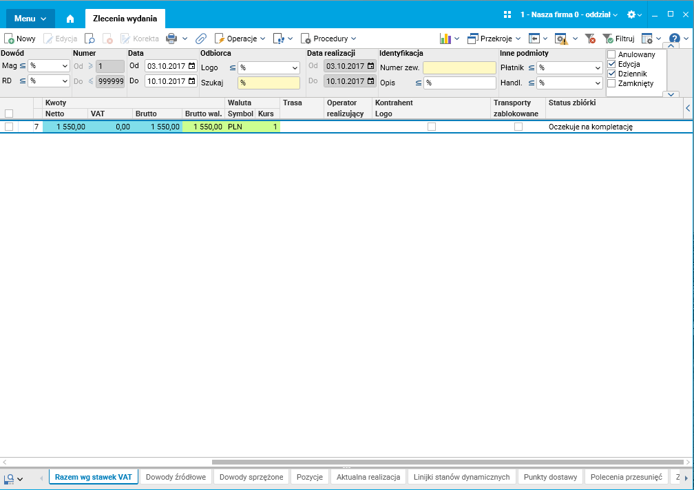 · Zamówienie w edycji – w momencie wygenerowania zamówienia / zlecenia wydania informuje o tym, że należy przenieść dowód do dziennika, zanim przejdziemy do generowania poleceń zbiórki,