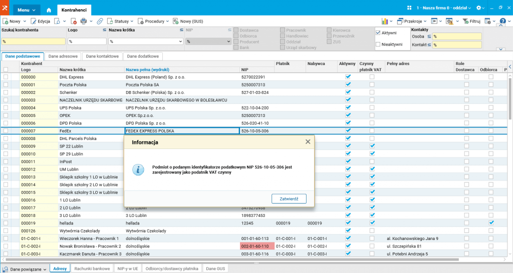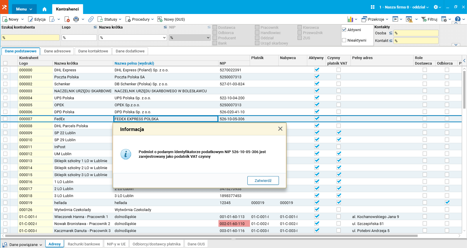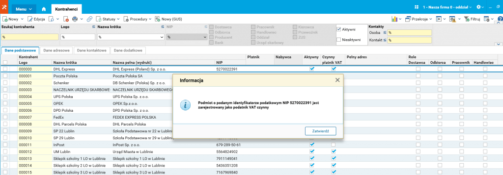 Po uruchomieniu procedury „Sprawdź status podatnika w VAT” system automatycznie połączy się z bazą „Portal Podatnika”, a następnie wyświetli komunikat z informacją, czy w rejestrze podmiot widoczny jest jako aktywny czy nie. W zależności od wyniku sprawdzenia system automatycznie zaproponuje ustawienie nowej wartości pola opisującego czy kontrahent jest czynnym podatnikiem czy nie.