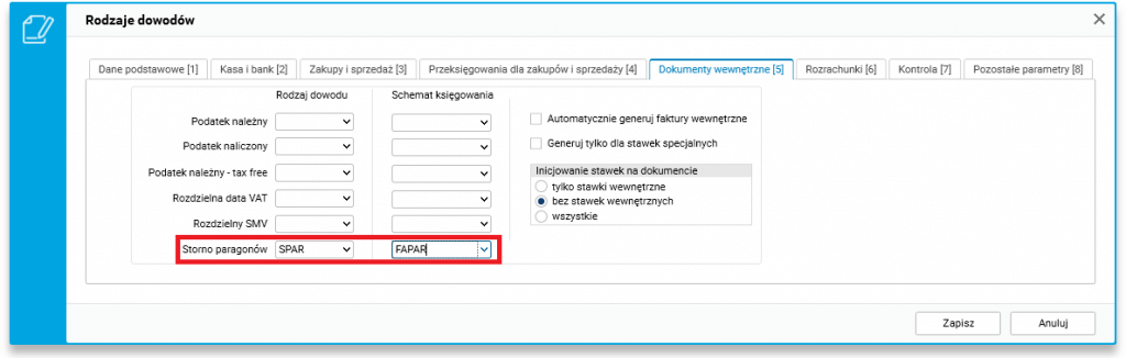 - Założyć w module finansowo-księgowym rodzaj dowodu dla storna paragonu (np. SPAR).