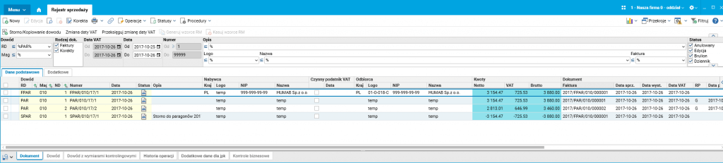 Dział księgowości przygotowuje comiesięczne zestawienie rejestrów VAT. Mimo wprowadzenia do ewidencji paragonów i faktur do paragonów, kwoty podatku nie są zdublowane, dzięki automatycznemu wystornowaniu paragonów, do których zostały wystawione faktury. Takie zestawienie jest kompletne.