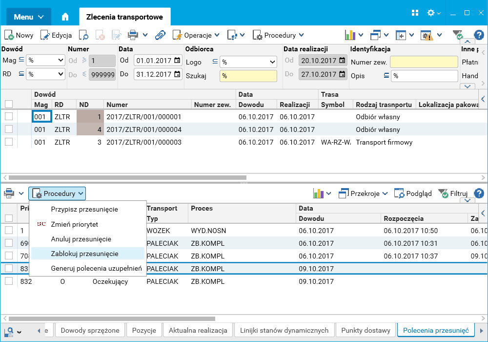 Po wygenerowaniu poleceń kompletacji należy te polecenia zablokować (zmieniając im status na zablokowany), np. w szczególe Polecenia przesunięć: